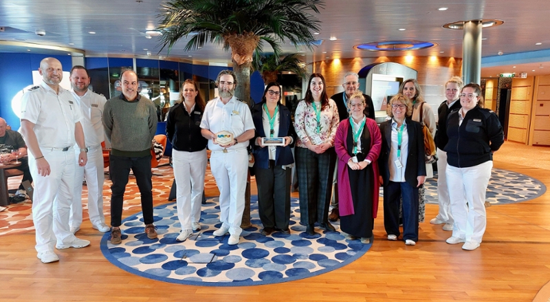 La vicepresidenta Maria Puig assisteix a l'entrega de la mètopa al vaixell AIDAluna que fa escala per primera vegada al porta de Palamós